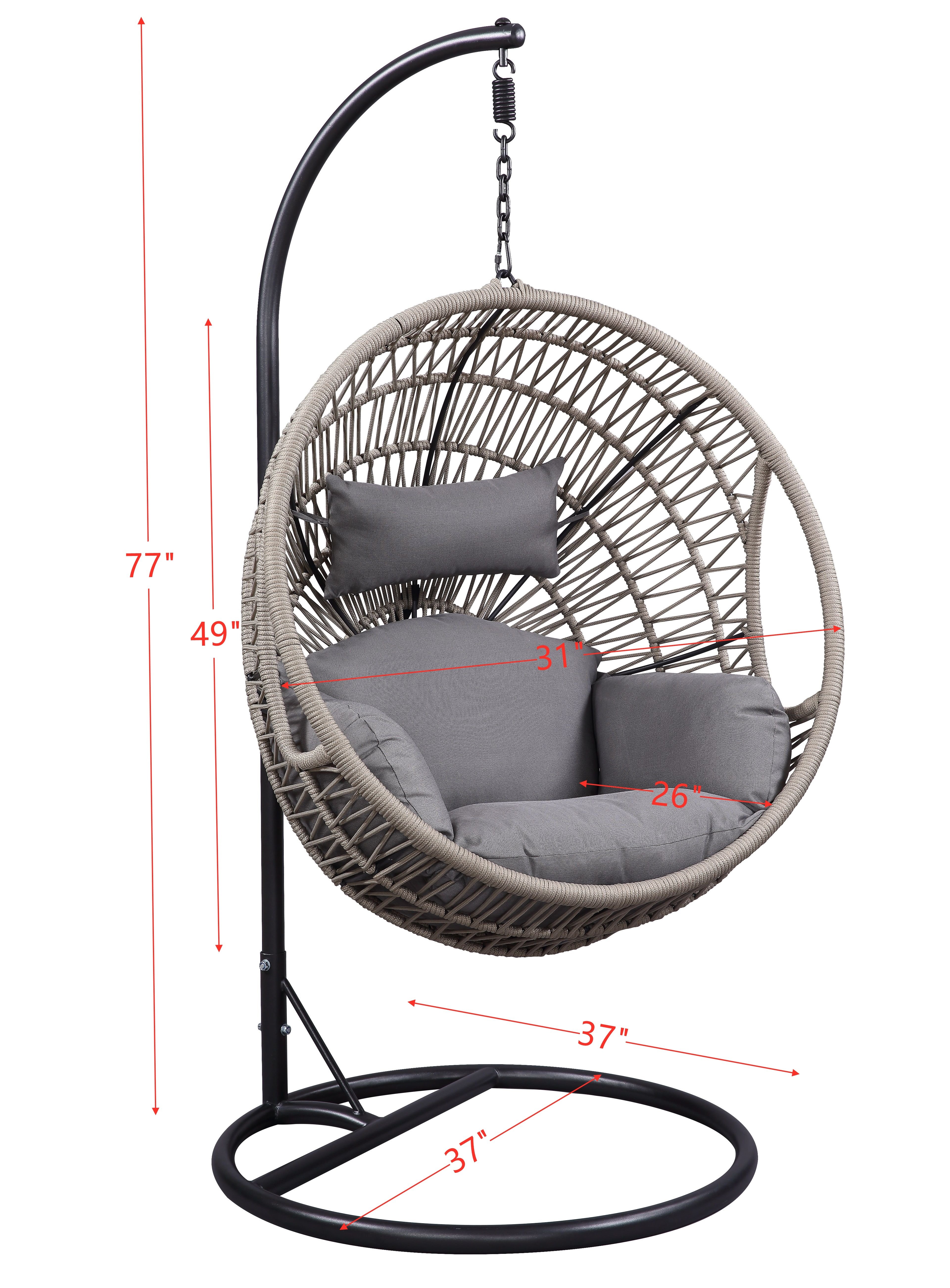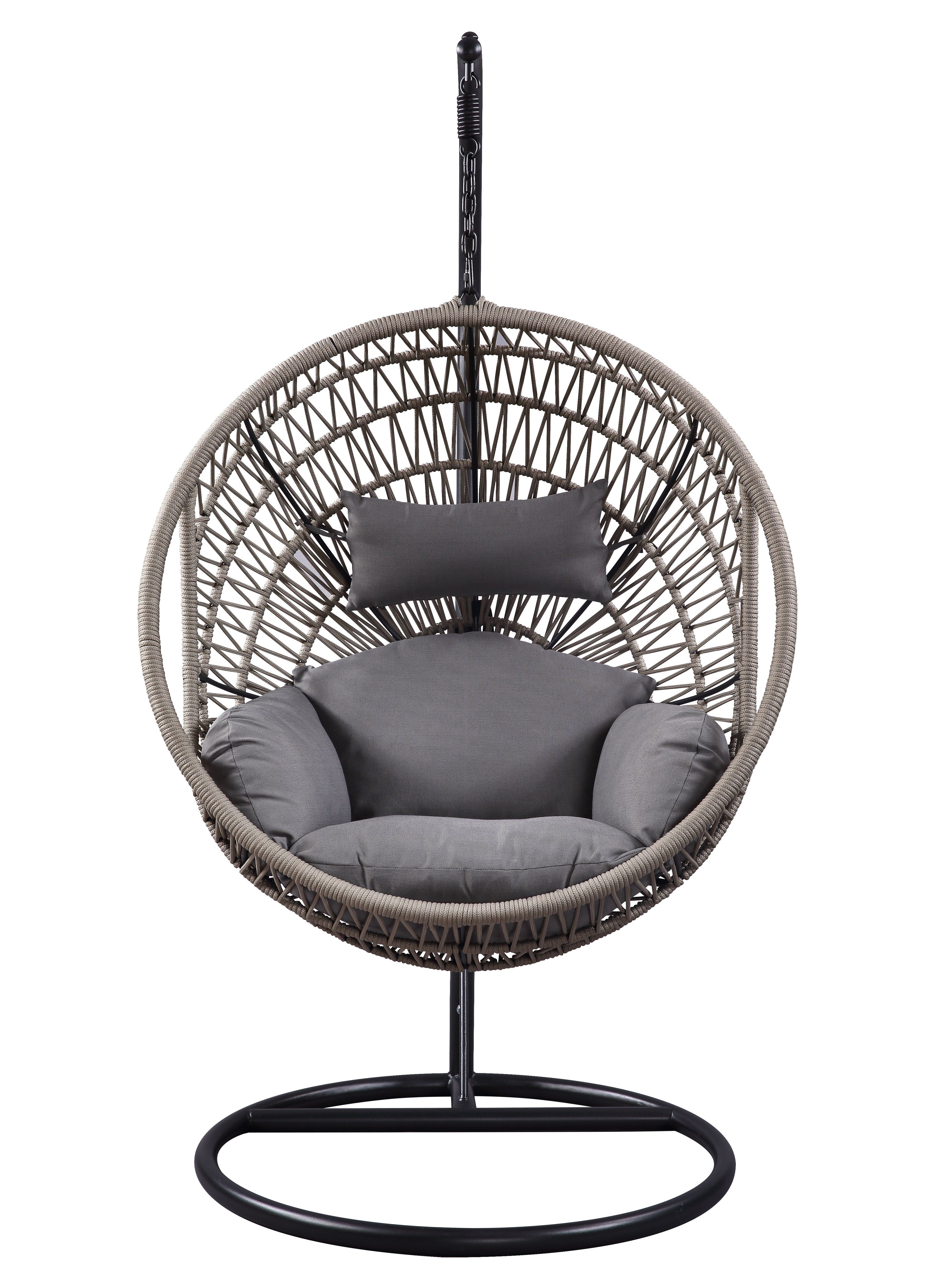 Product Details•KD, Patio Swing Chair & Stand• Seat Cushion Included (Removable)• Includes: Swing Chair, Stand, Cushion• CONSTRUCTION: Frame Black Finish, Polyester Rope (mm Round) & Steel Powder Coated (mm)• SEAT CUSHION: Fabric• Material: Fabric (Solid Pattern)