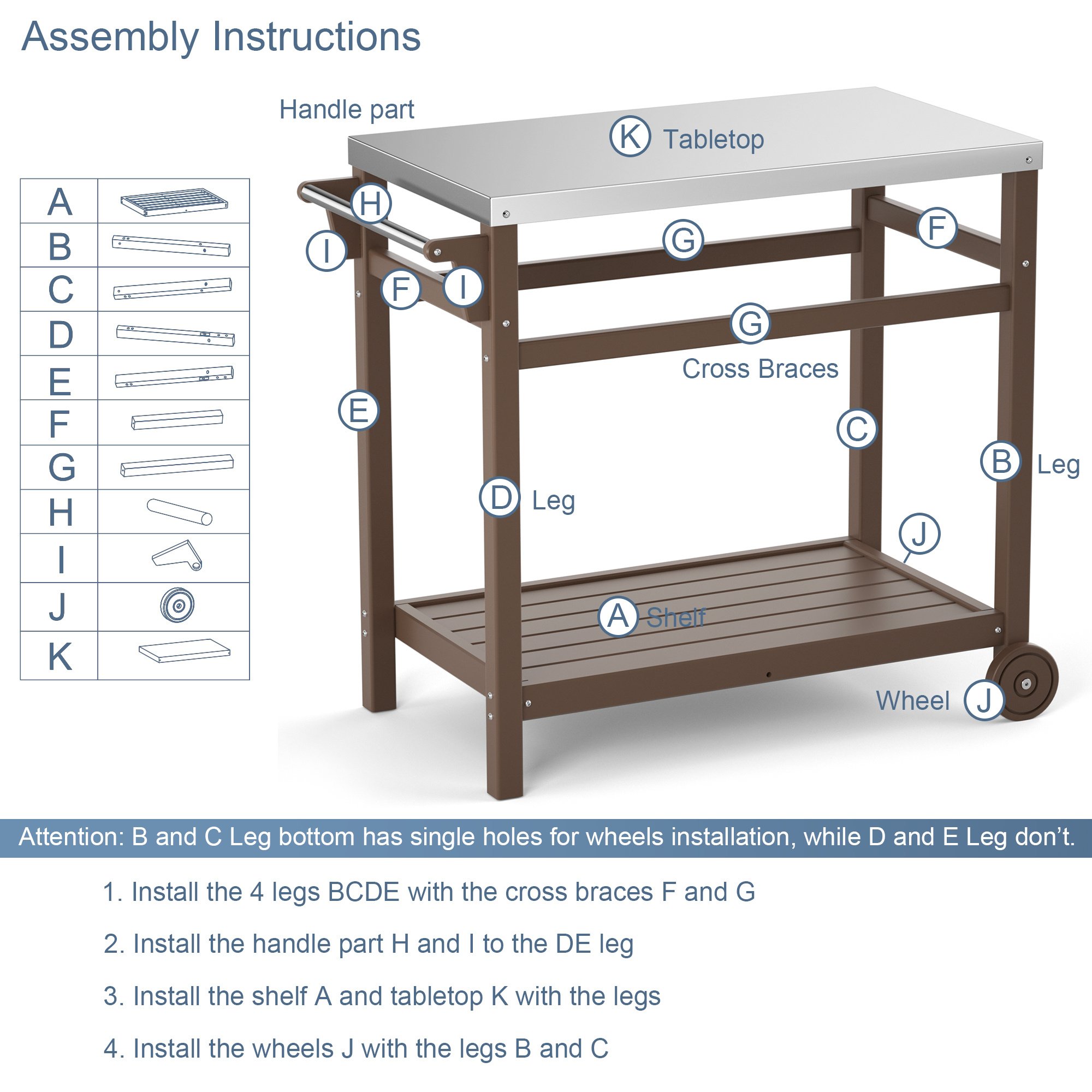 7.[Utility Outdoor Cart and Low Maintenance] You can put pizza oven; portable grill; deep fryer on the countertop. They will rests securely on the top surface of this cart. The cart table top is made out of stainless steel so it will sustain all the food preparation and knife cutting. The table weight distribution is well balanced; so it will not tip over when you use it. The stainless steel top means durability; utility and little maintenance.
